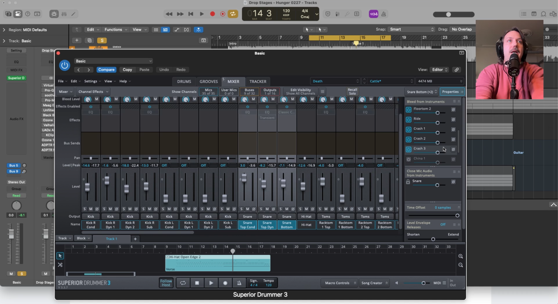 Bleed is what glues the components of drums together, so they don’t sound like individual samples. When a snare hits, the overheads hear it. When the kick hits, the toms hear it. Enable bleed across your mic channels in the plugin and dial it in until the kit starts to feel cohesive and alive. Think critically about mic position. If you have a stereo pair of overhead mics, they would naturally pick up all the cymbals, not one or two, and probably the shells as well, etc. This single step will do more for realism than any amount of processing downstream.
