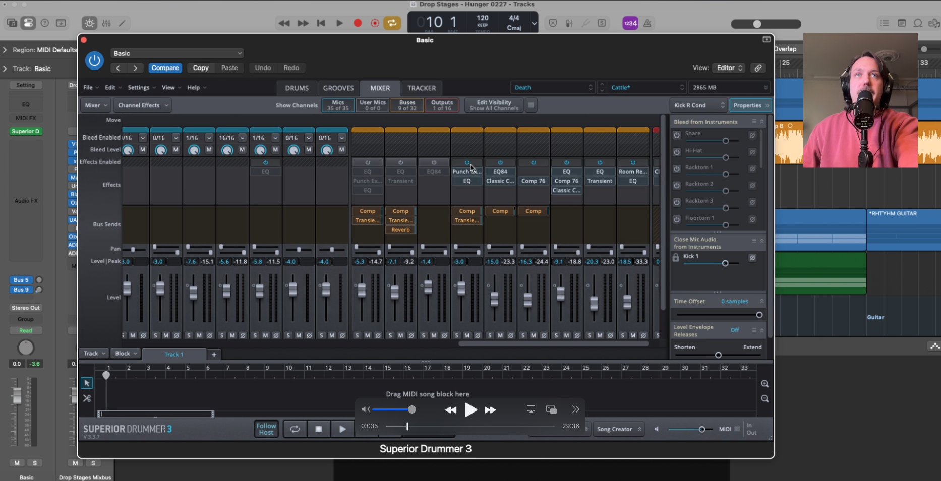 Target 3–5 dB GR on your shell compression, not 10+ (seriously). This is where most people over-process and kill the life they've built up through humanization. On your shells, keep compression subtle — 3 to 5 dB of gain reduction maximum. You're adding punch and control, not squashing transients. Use EQ to sculpt each mic channel for its specific role: sub and attack on the kick, crack and rattle on the snare, air and shimmer on the overheads. Less is more at this stage.