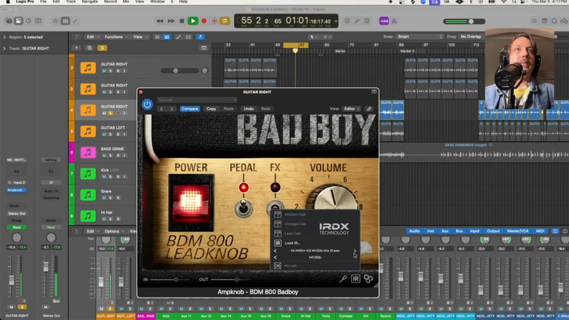 The cabinet is actually doing the most work in your guitar tone. If you’re working in the box, you can’t rely on stock IRs to get an organic sound. Third-party IRs from companies like York Audio are a significant upgrade; they're based on real cabinets captured in controlled environments, and they have a dimensionality that stock IRs often lack. For the Marshall side, York Audio's Marshall 4x12 IR is the natural pairing. For the 5150 side, York Audio also has a 5152 cabinet IR. Use a mix of mic positions — an SM57 for the attack and presence, and a Royer 121 blended in for woodiness and low-end body. The 121 is what adds that thick, organic quality that makes the guitars feel like they're coming from a real cab in a real room.