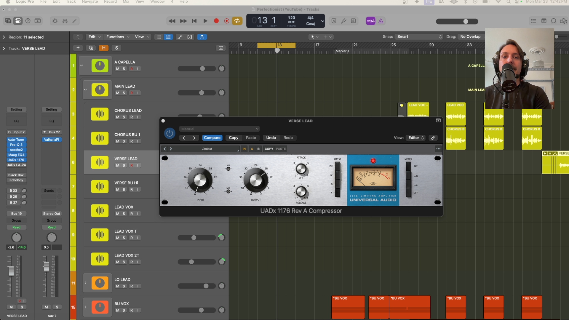 Vocals have enormous dynamic range as a natural instrument, and that range needs to be tamed before the vocal can sit reliably in a mix. Use a fast attack to tame peaks, a medium release that breathes with the tempo, and don't be afraid of 6–8dB of gain reduction on loud passages. For the first stage I use either Distressor or 1176 every time. Both are fast and work hard to keep vocals in line.